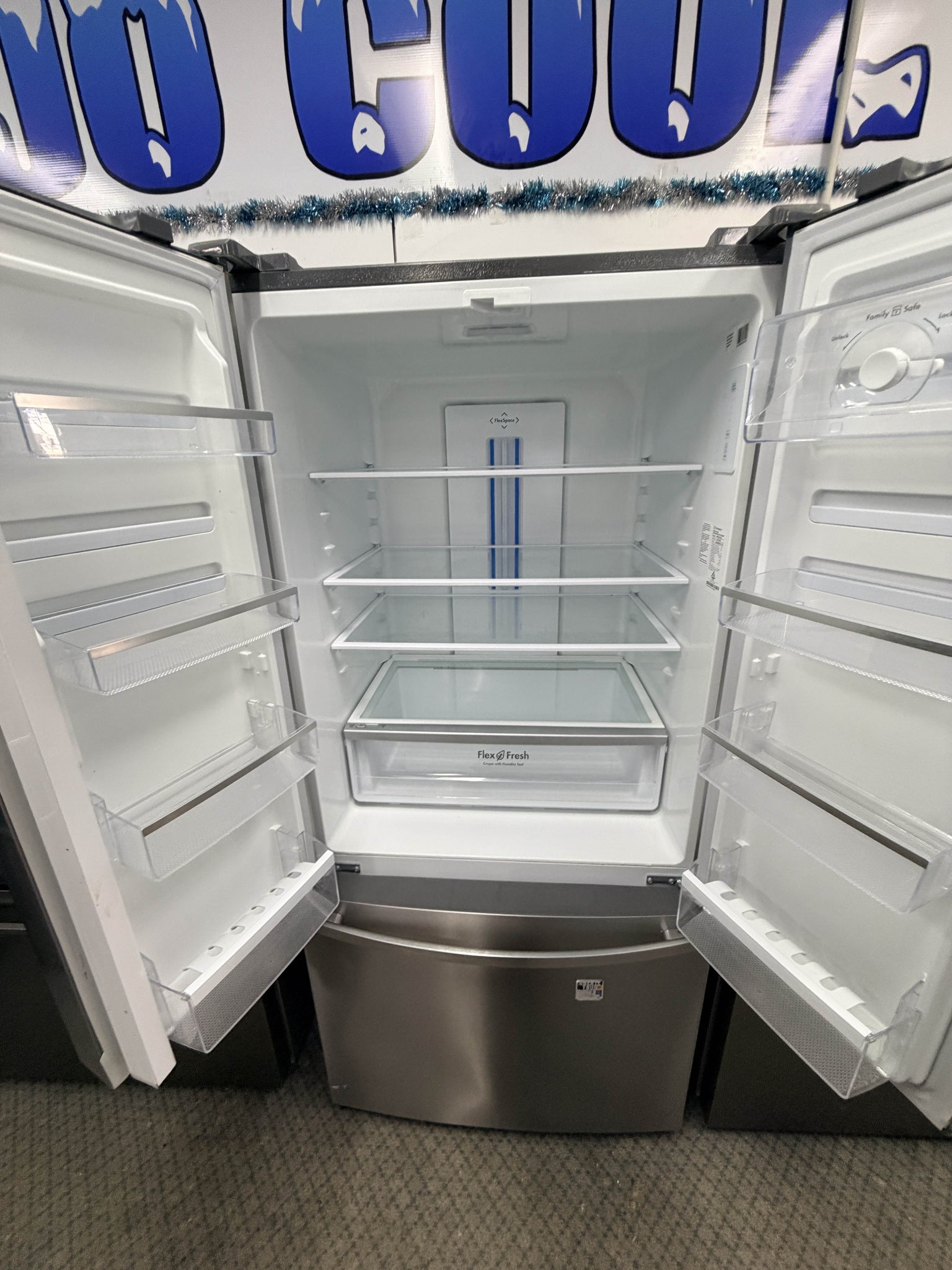 Features: SpillSafe™ glass shelves, FlexFresh™ crisper with divider, FlexStor™ adjustable door bins, self-close freezer drawer, internal touch controls, blue feature lighting