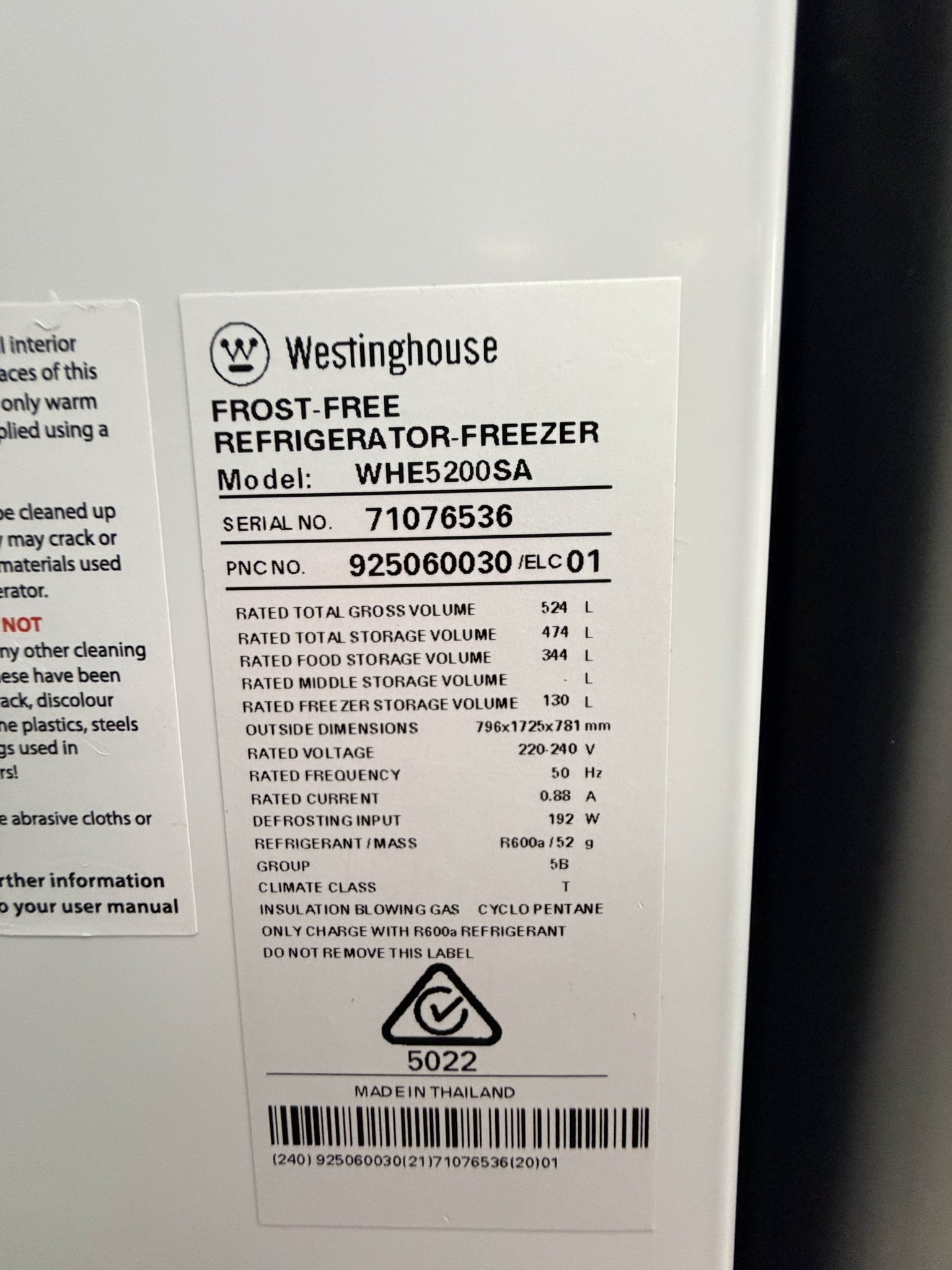 Keywords: Westinghouse WHE5200SA, 524 L fridge, French‑door refrigerator, stainless steel fridge, frost‑free Westinghouse, FlexSpace fridge, SpillSafe shelving, Perth whitegoods, second‑hand fridge, fridge delivery Perth