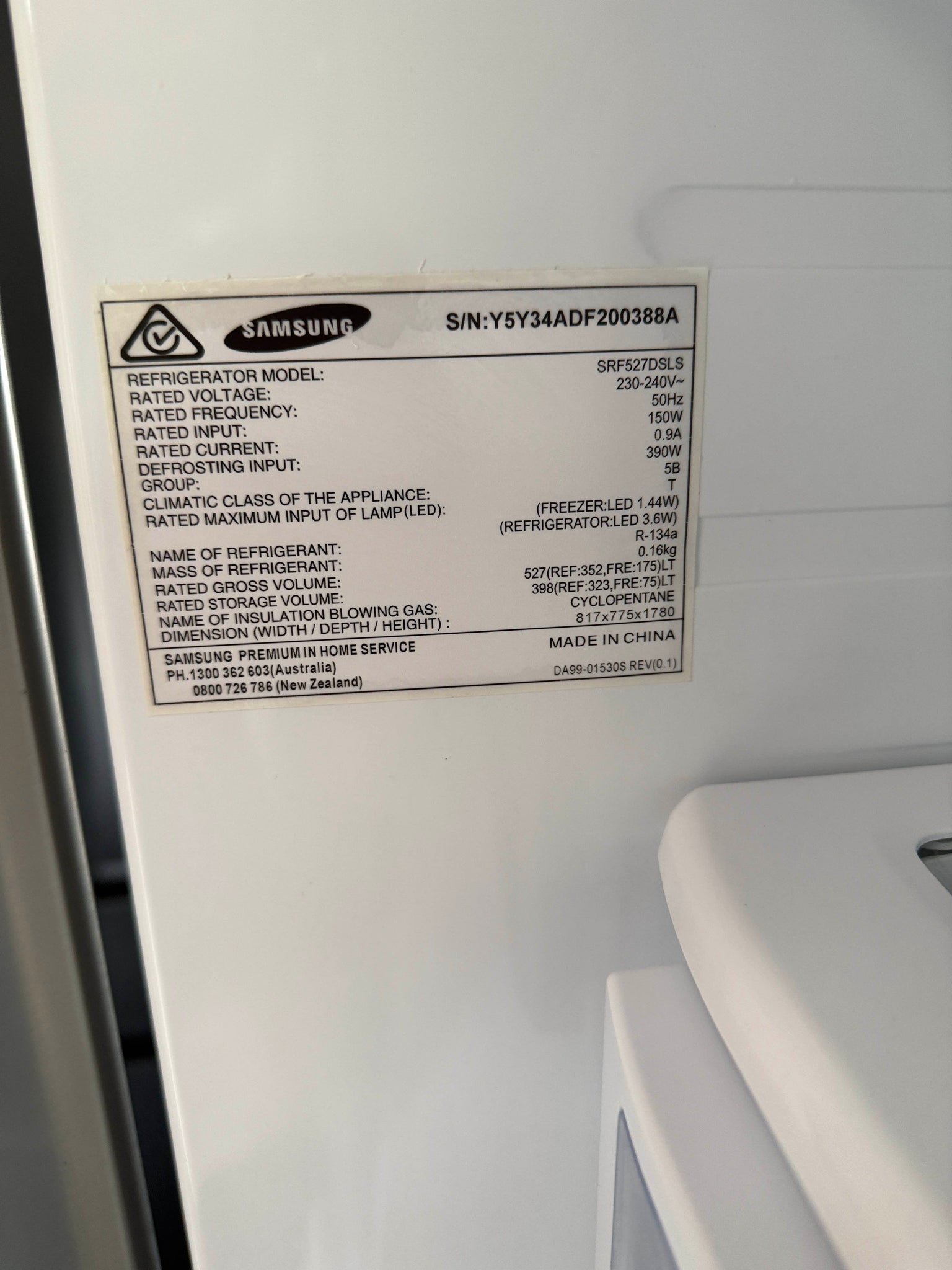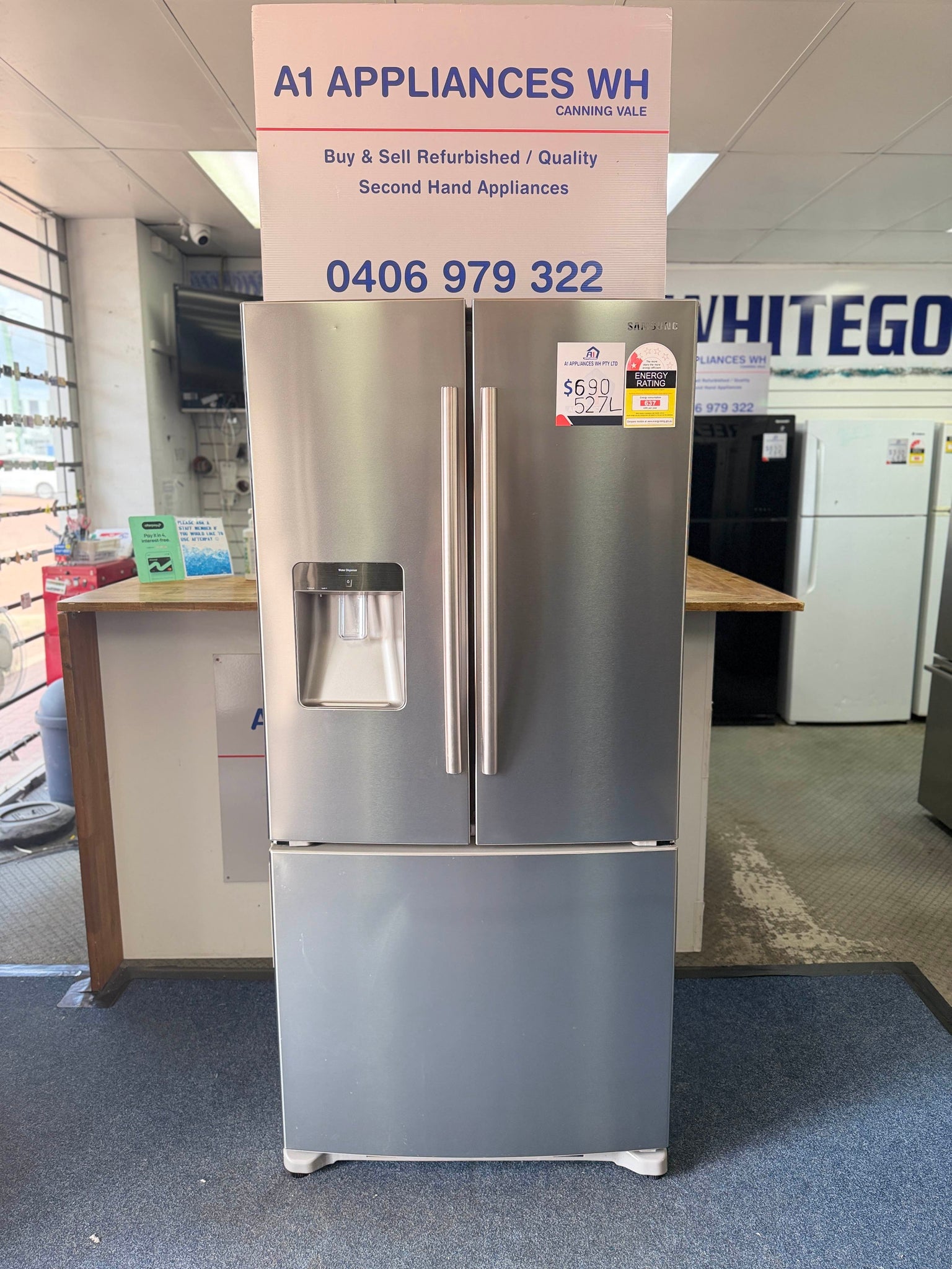 Keywords: Samsung refrigerator, French door fridge, 527L capacity, stainless steel, twist ice maker, refillable water dispenser, Twin Cooling, frost-free, Perth delivery, refurbished fridge, second hand fridge, whitegoods