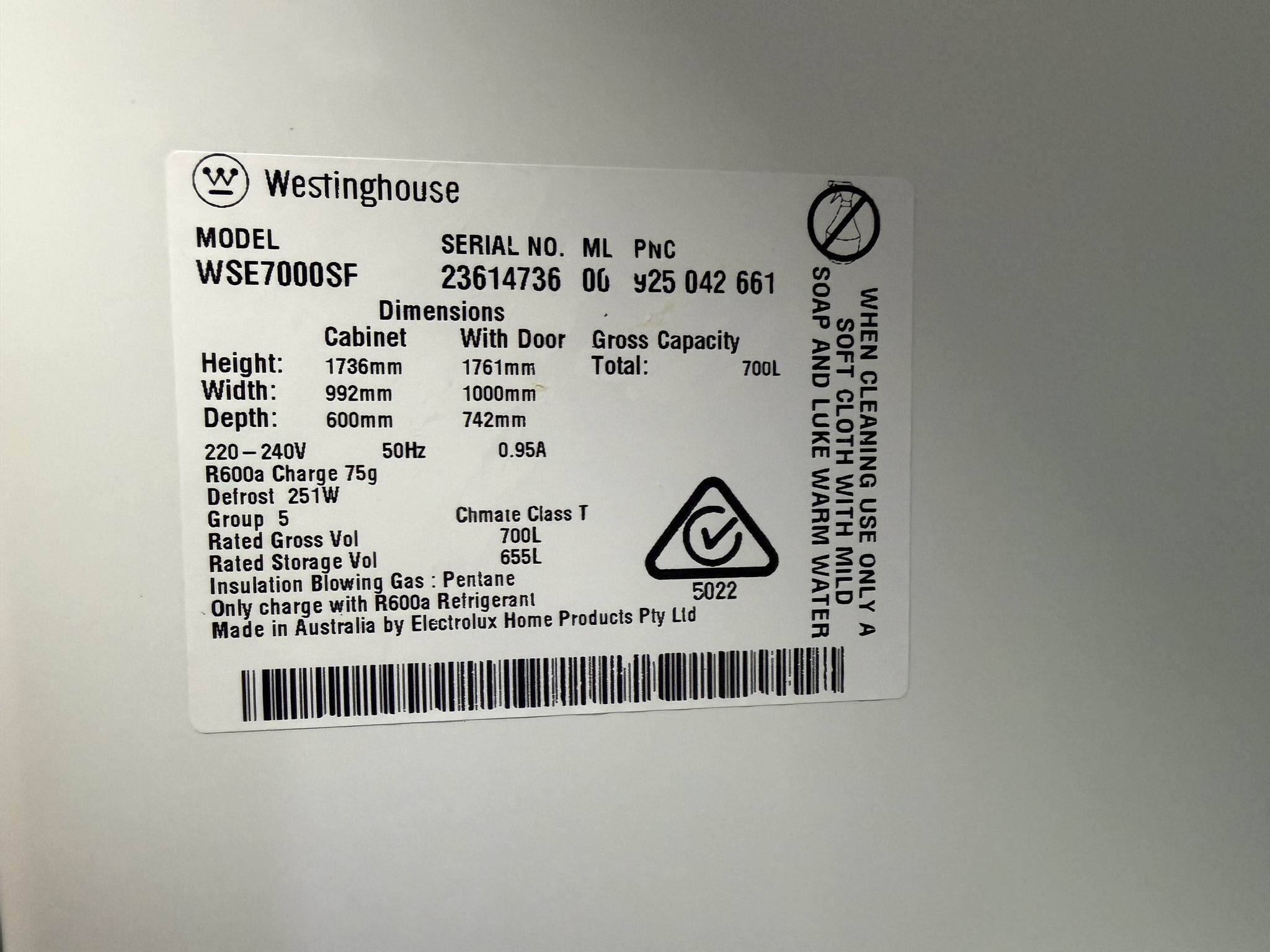 Keywords: Westinghouse refrigerator, side by side fridge, 700L capacity, stainless steel, family fridge, Perth delivery, refurbished fridge, second hand fridge, whitegoods, large capacity fridge