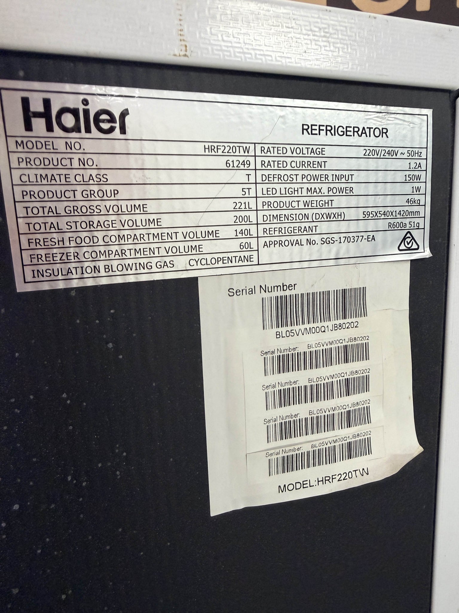 Keywords: Haier HRF220TW, 221L fridge freezer, top‑mount fridge freezer, compact fridge, white fridge freezer, frost‑free fridge, family fridge, Perth whitegoods, second‑hand fridge, fridge delivery Perth.