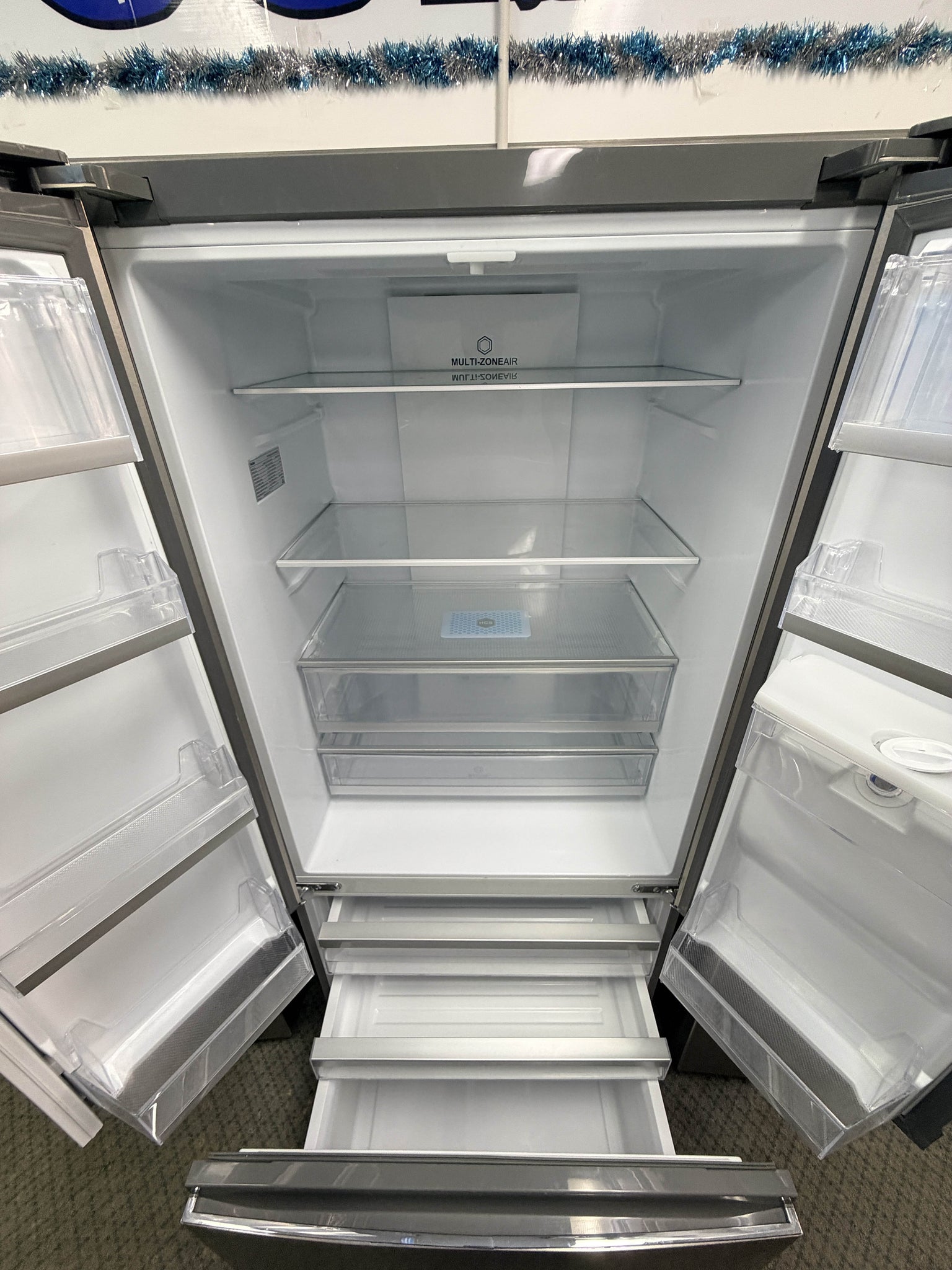 The Haier HRF520FHS is a 489‑litre French-door refrigerator designed for modern households needing flexible storage and convenient features. It includes a non‑plumbed water dispenser for chilled water, an adjustable “My Zone” temperature drawer for drinks, meat, or seafood, and a humidity-controlled crisper to keep produce fresh. The fridge compartment has adjustable glass shelves and spacious door bins, while the freezer section features three easy-access drawers and a “Super Freeze” function for rapid freezing. Finished in Satina, with external LED controls and LED interior lighting, this model combines style, convenience, and efficient cooling.
