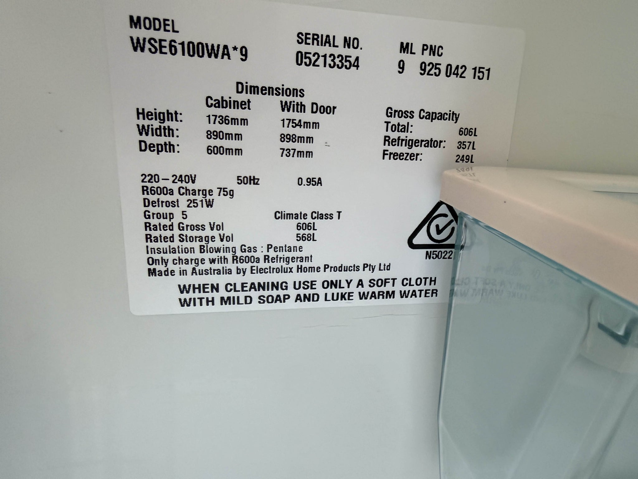 Keywords: Westinghouse refrigerator, side by side fridge, 610L capacity, white fridge, family fridge, Perth delivery, refurbished fridge, second hand fridge, whitegoods, Spillsafe shelves