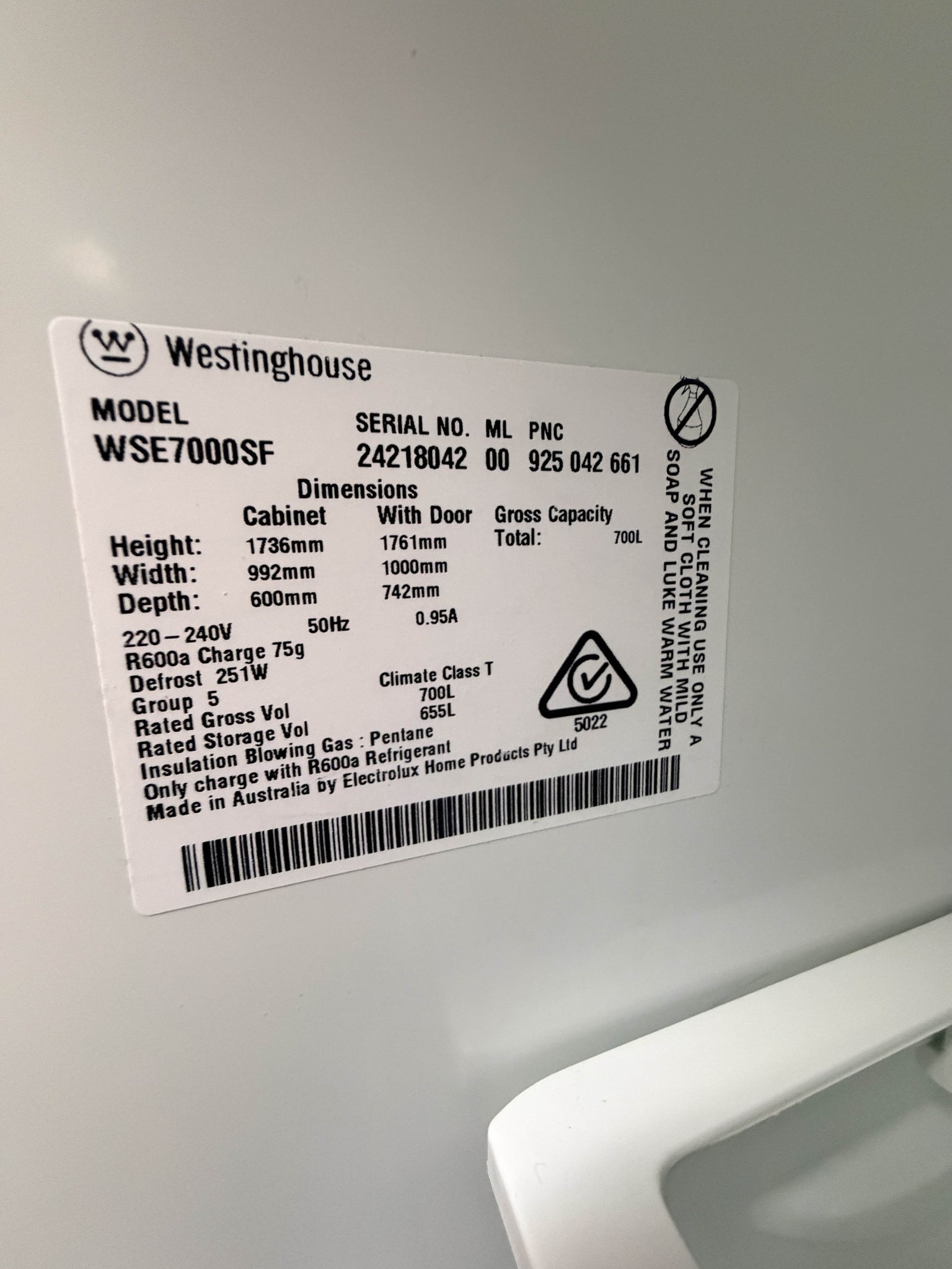 Keywords: Westinghouse WSE7000SF, 700 L fridge, side‑by‑side refrigerator, large capacity fridge, frost‑free fridge, stainless steel fridge, family fridge, big fridge, fridge freezer Australia, fridge delivery Perth
