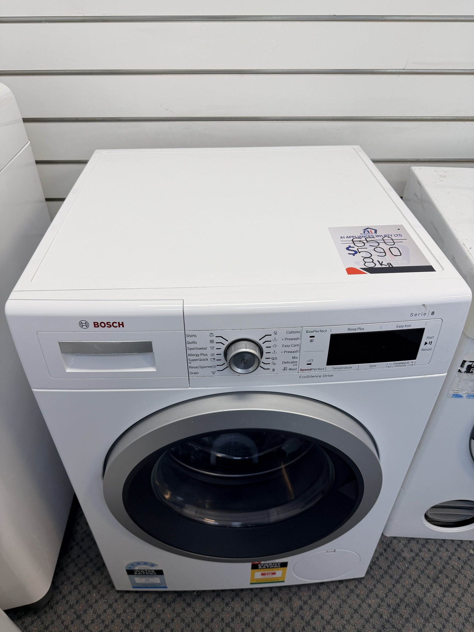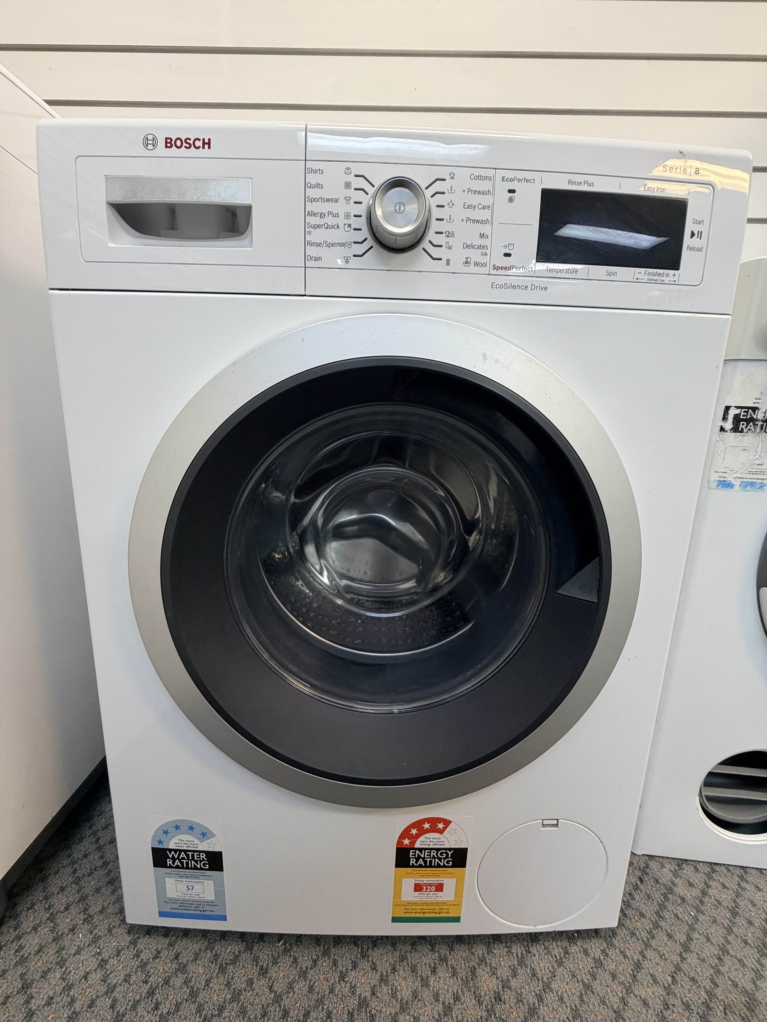 Keywords: Bosch washer, front load washing machine, 8kg capacity, Series 8 Bosch, 1400 rpm spin, EcoSilence Drive, VarioPerfect, ActiveWater Plus, family washer, Perth delivery, refurbished washer, second-hand washer, whitegoods