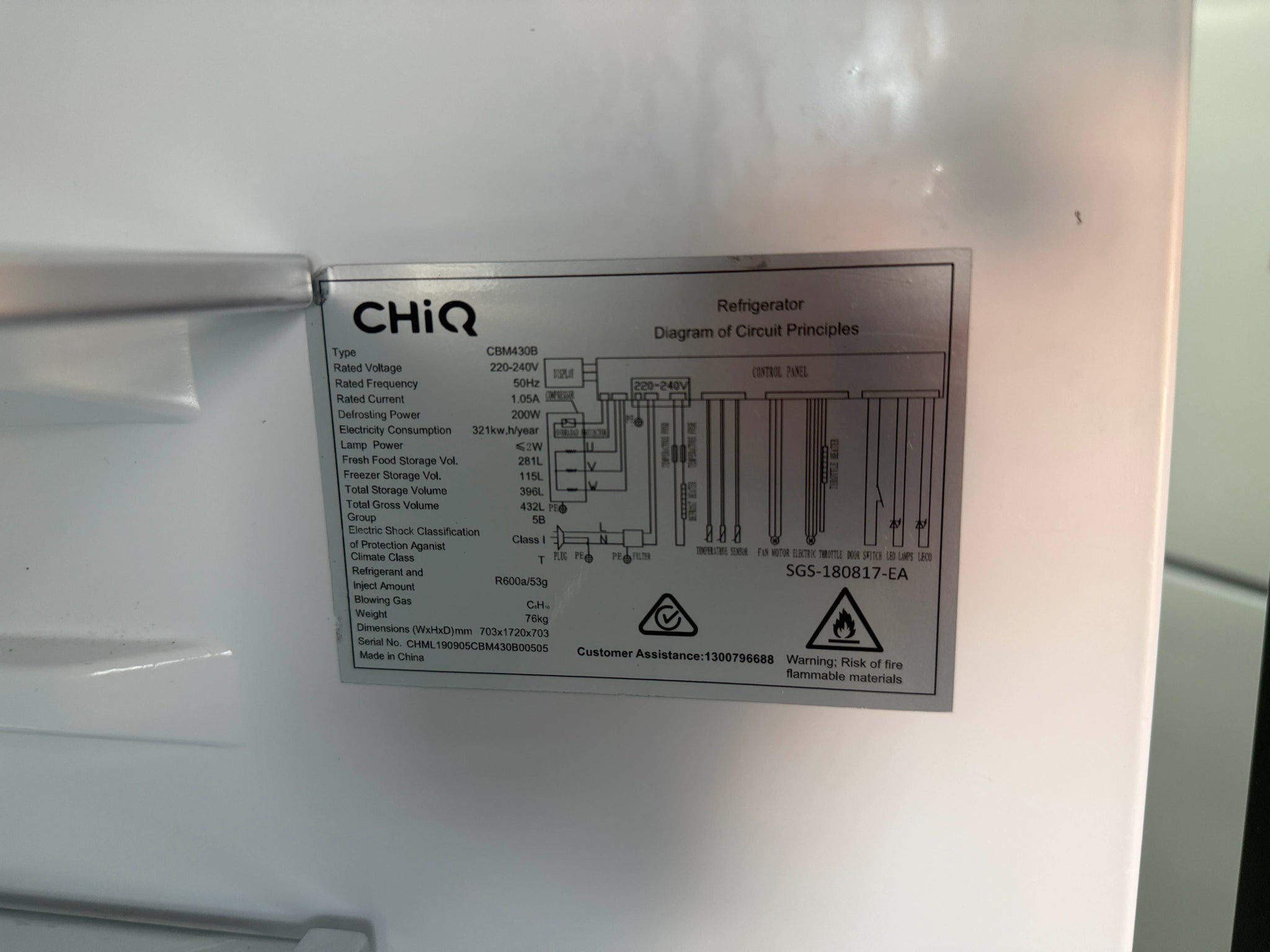 Keywords: CHiQ refrigerator, bottom mount fridge, 432 L capacity, black steel finish, frost-free, inverter system, R600a refrigerant, family fridge, Perth delivery, refurbished fridge, second hand fridge, whitegoods