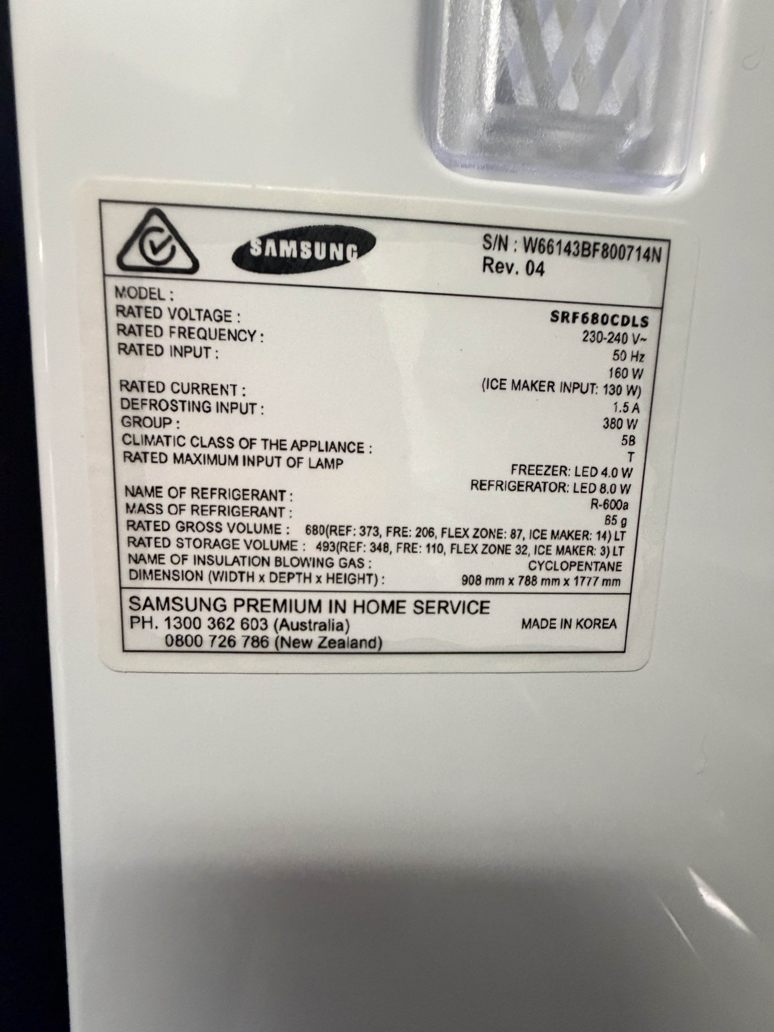 Samsung SRF680CDLS, 680 L fridge, French door refrigerator, stainless steel fridge, Samsung large fridge, family refrigerator, frost free fridge, spacious fridge freezer, ice and water dispenser fridge, Perth whitegoods, second-hand fridge, fridge delivery Perth